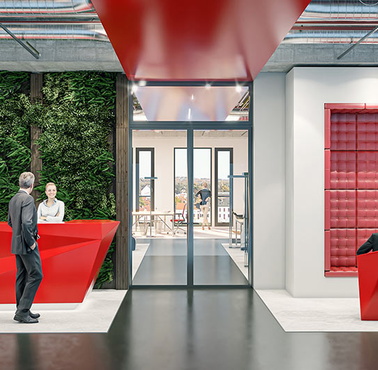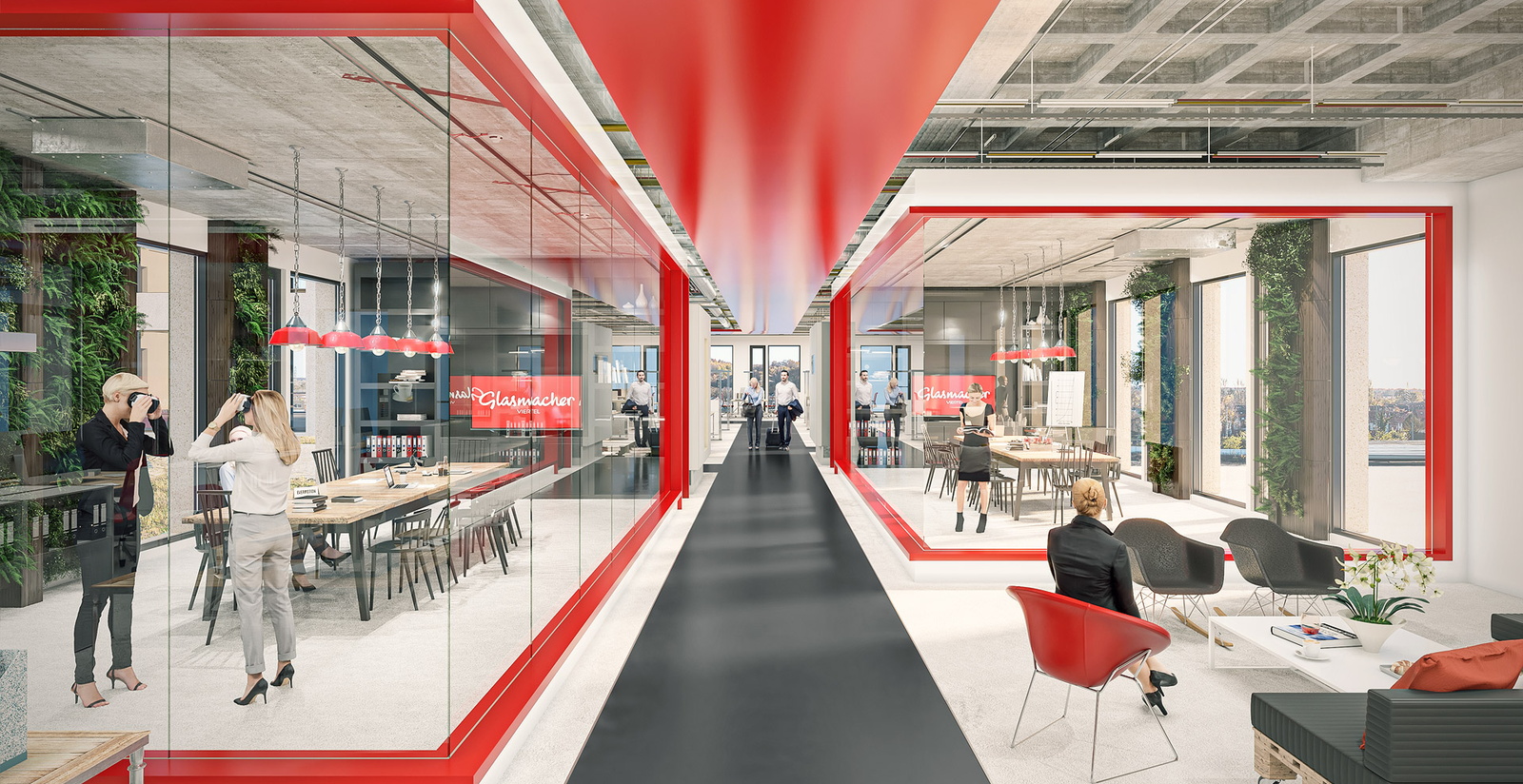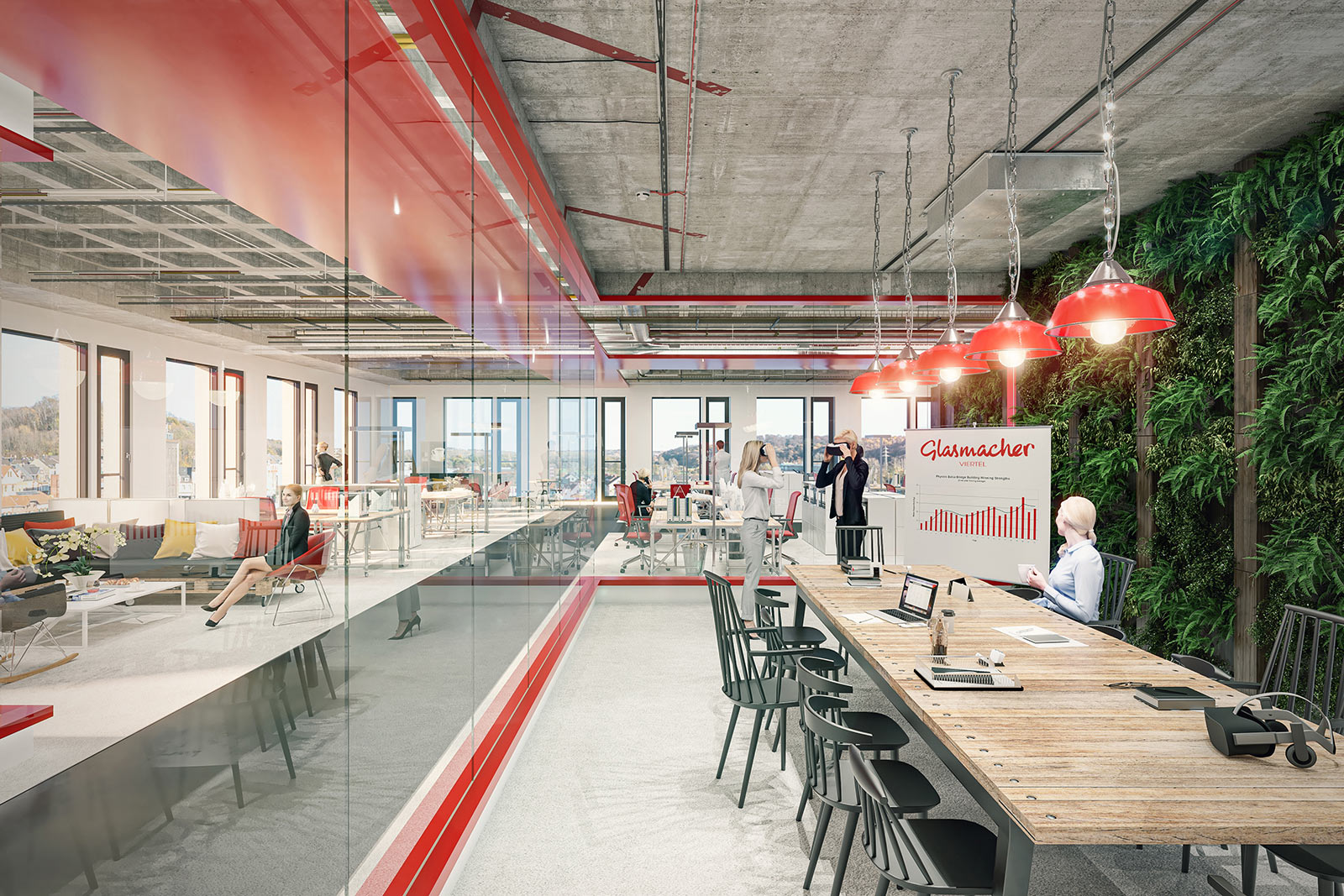 Für die Büroflächen im Turm entwarfen wir das komplette Interior Design. Passend zur Historie des Areals entschieden wir uns für einen coolen Industrial Chic mit Grünwänden und dem Rot des Glasmacherviertels.